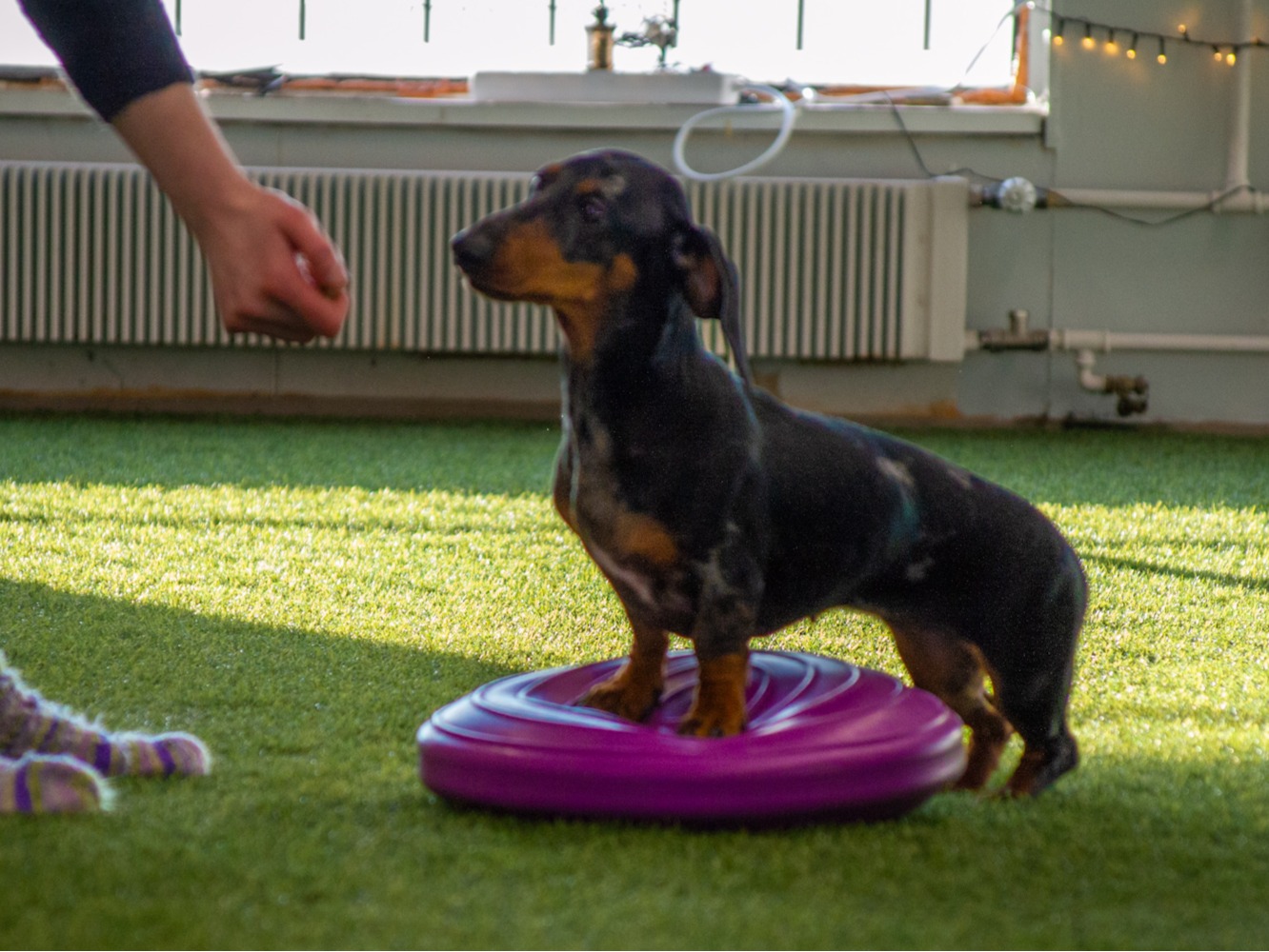 Kehonhallintatunnilla harjoitellaan jokaisen koirakin tason mukaan dobopalloilla ja lörpillä, tehdään venytyksiä ja opetellaan kevyitä hierontaotteita. Tunnille voi osallistua pennun ja kisakoirankin kanssa.